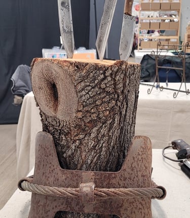 At The Blue Viking, Daeg Draco transforms scrap metal into lamps, clocks, and blades with wood and resin handles.